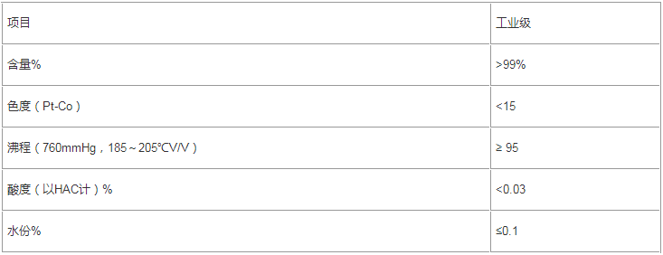本品為優良、高效、安全無毒的有機溶劑。產品已通過ISO-9001質量管理體系認證,執行Q/320282NPL001-2002標準,廣泛用于制藥工業;食品添加劑工業;香精香料的配制中作為水果香源;也作為各種有機樹脂特別是硝化纖維素的優良溶劑,和皮革光亮劑的原料。